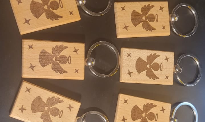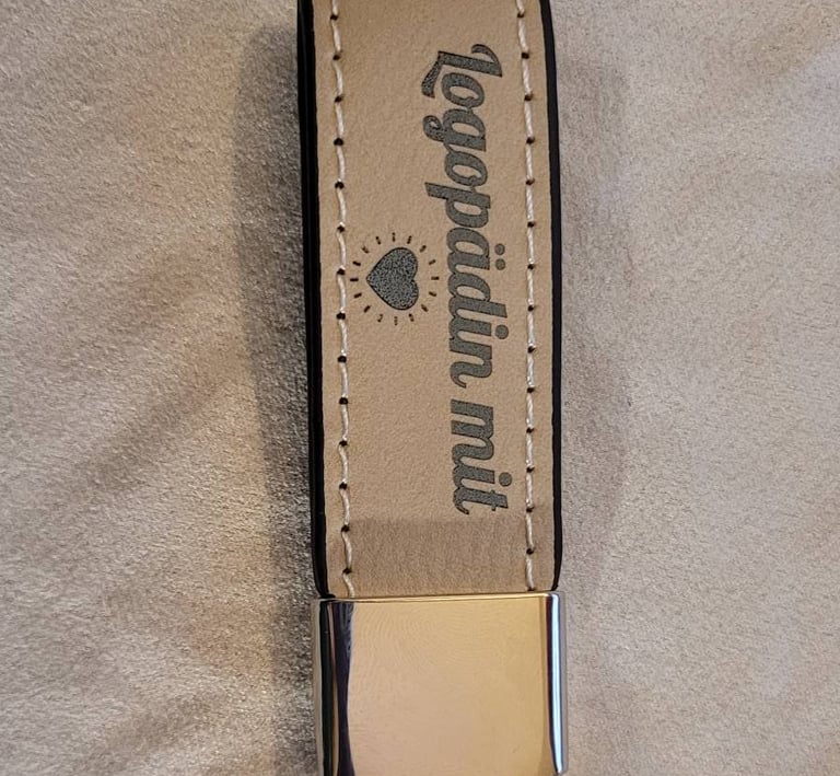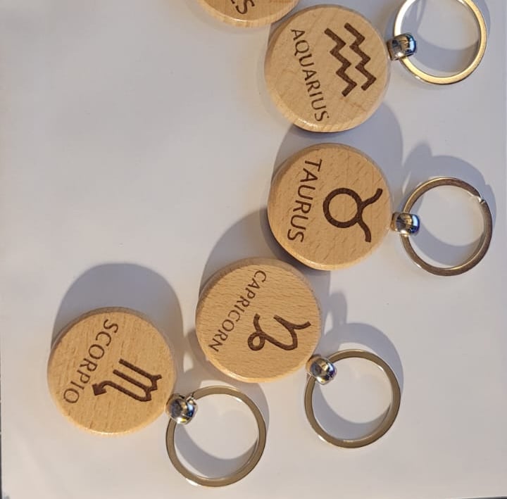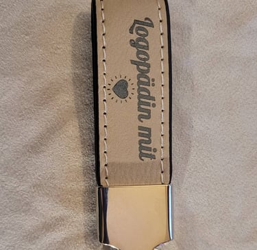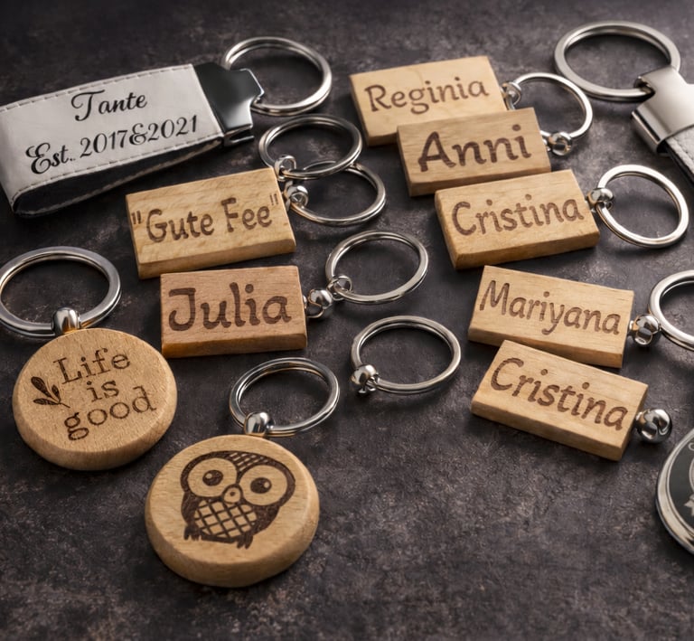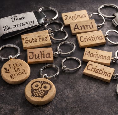 Handgravierte Schlüsselanhänger aus Leder und Holz.